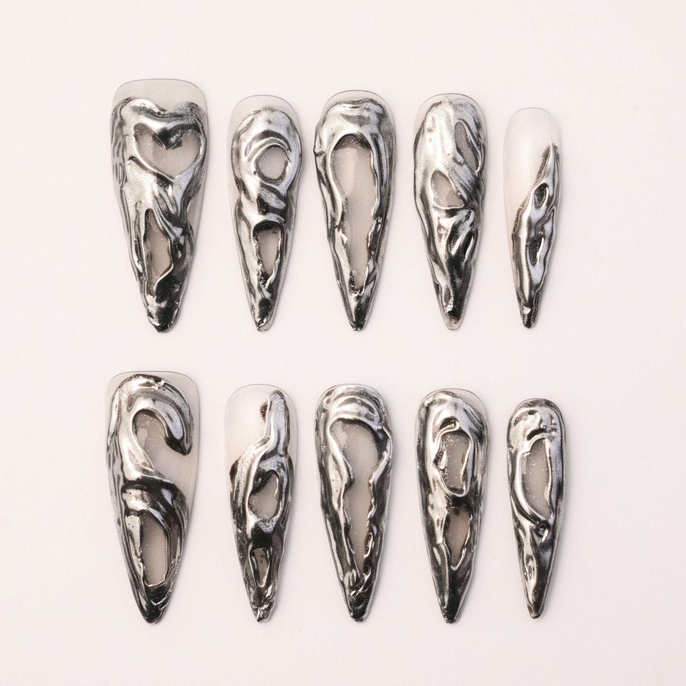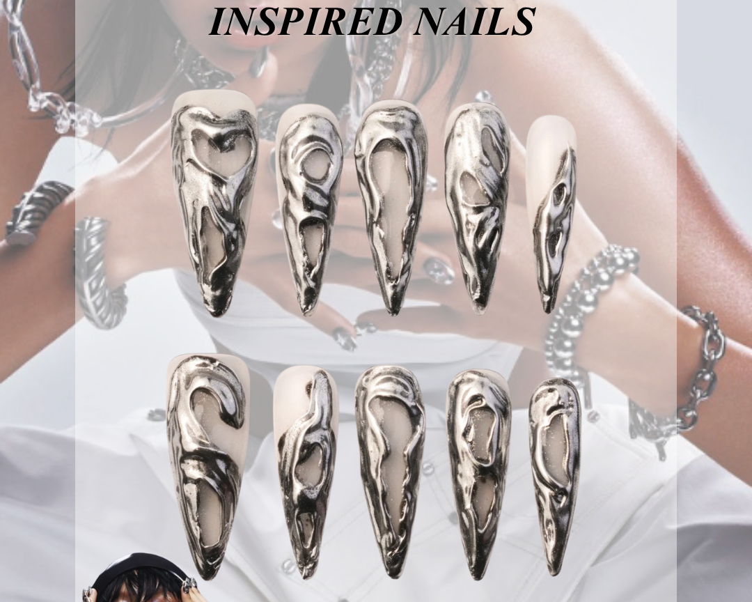 Presentamos las uñas artesanales "Anti Hero Silver", donde la audacia se fusiona con la elegancia. Cada set presenta diseños meticulosamente elaborados que combinan elementos vanguardistas y chic, creando un look espectacular.