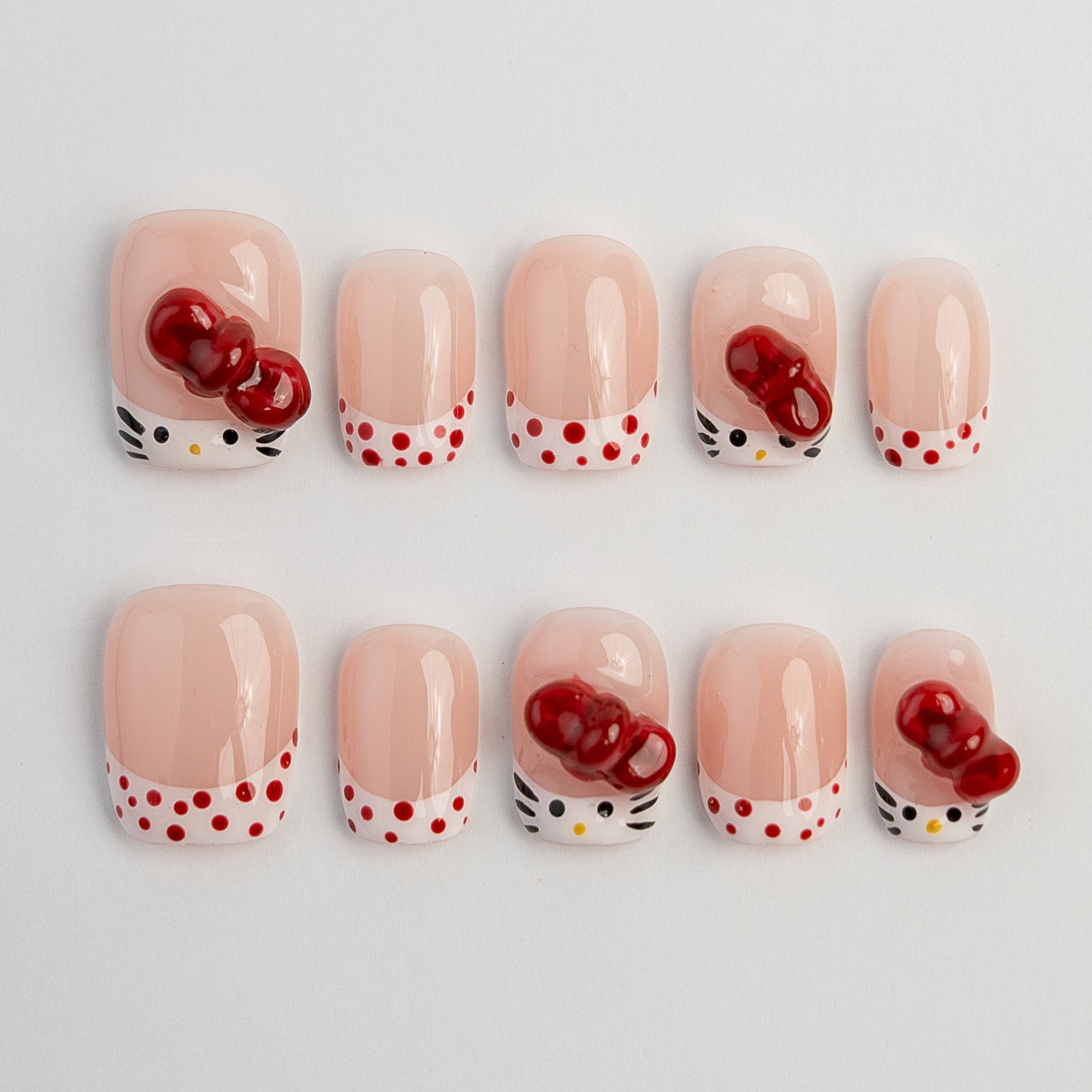 "Kitty Dot" : Un elegante diseño francés corto con delicados lunares y adorables lazos, hecho a mano con gel premium para un look kawaii atemporal. ¡Duradero y reutilizable para múltiples usos!