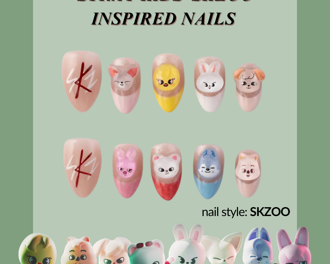 Inspirado en los queridos personajes de SKZOO, este divertido set presenta caras de animales en 3D pintadas a mano, llenas de encanto y personalidad. Con una combinación de bases suaves y brillantes y detalles atrevidos, es perfecto para las fans del K-pop que buscan uñas con un toque de ternura y estilo.