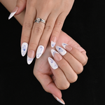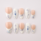 Inspired by traditional Chinese ceramics, this set features elegant blue floral and bamboo motifs on a milky white base. The nude tips balance the intricate art with a modern, minimal aesthetic. Small pearls add a gentle, timeless charm reminiscent of porcelain vases.