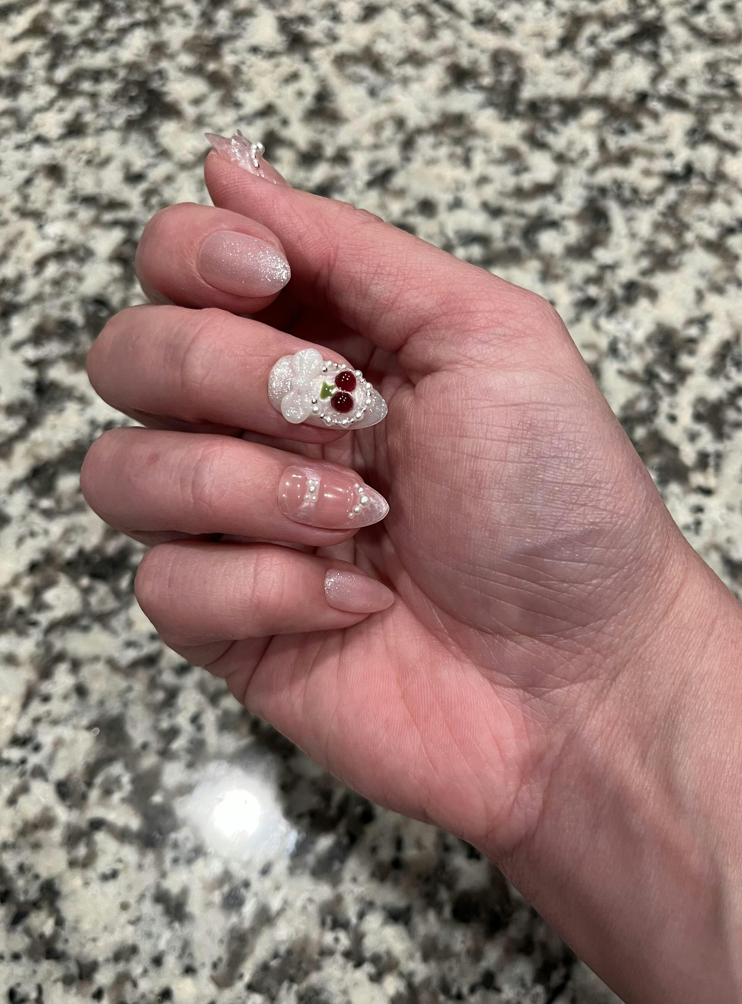 "Cherry on Top" is a playful and sweet set of handmade press-on nails, featuring soft pink tones accented with adorable cherry-inspired designs. Perfect for adding a pop of charm to your everyday look!