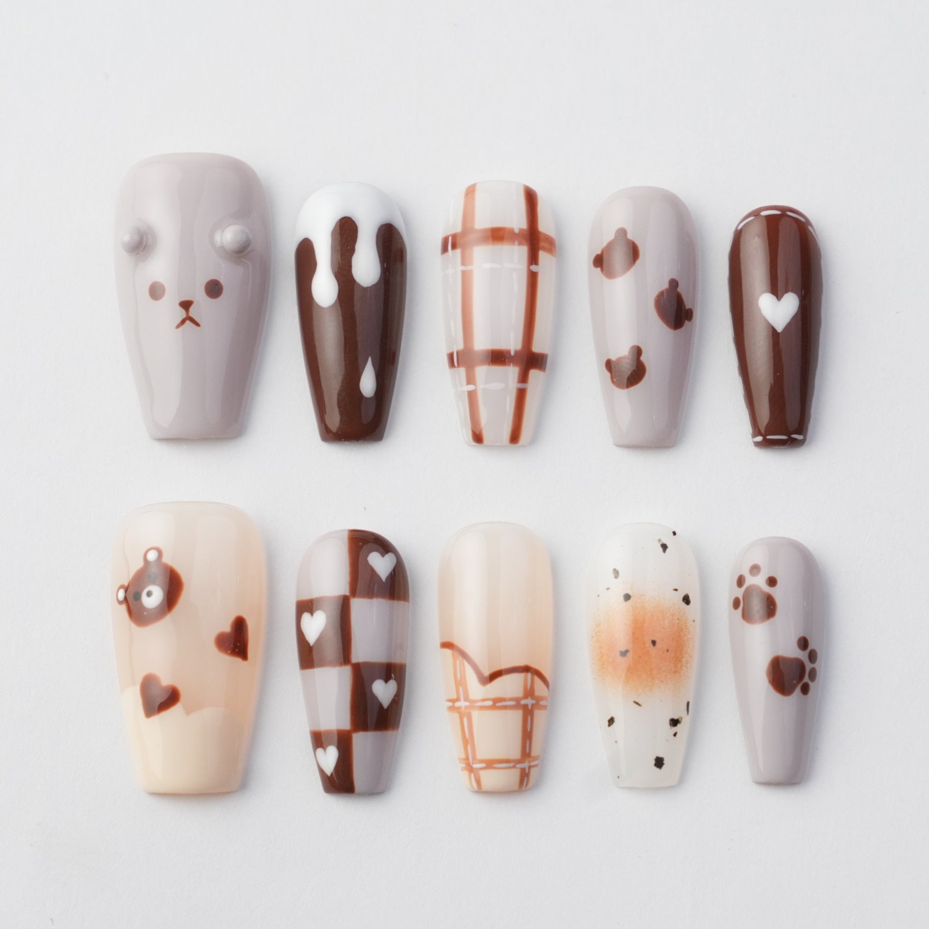 Add a touch of cozy charm with our "Coco Bear" handmade press-on nails, featuring warm neutral tones, adorable bear accents, and sweet cocoa-inspired details. Perfect for those who love a playful yet sophisticated style!