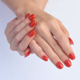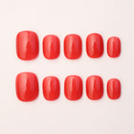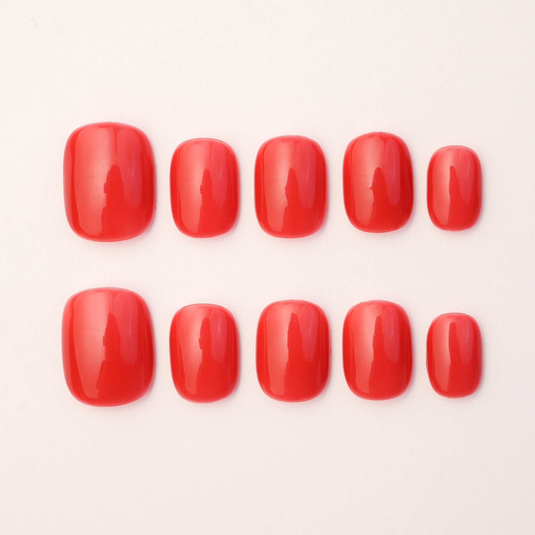 These short round press-on nails feature a vibrant coral hue, adding a fresh and cheerful touch to your look.