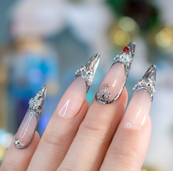 Dark romance meets royal edge — Gothic Empress blends soft nude tones with heavy silver framing, crimson stones, and cross details. Inspired by Lisa’s “FUTW,” this set reigns with quiet danger and divine confidence.