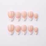 Soft nude-pink nails meet delicate white tips adorned with sweet polka dots and a subtle bow detail for an elegant, feminine finish. This design is minimal yet charming, perfect for everyday wear, bridal looks, or a polished soft-girl aesthetic.