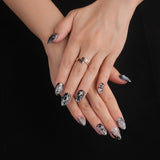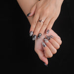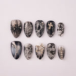 An edgy black-and-silver masterpiece inspired by cosmic energy. The marble texture, glitter accents, and metallic stars bring out a celestial glow. Dramatic, mysterious, and fiercely modern — it’s pure interstellar glam.