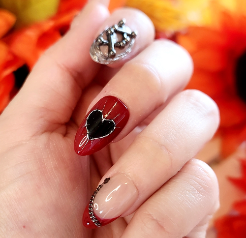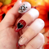 A daring blend of sweet and fierce. Nude and crimson nails are adorned with jeweled cherries, metallic chains, and stitched heart details. The lace-up chrome accents give a rebellious edge, while the playful bow-and-cherry design softens the look—perfect for those who embrace both romance and attitude.