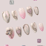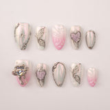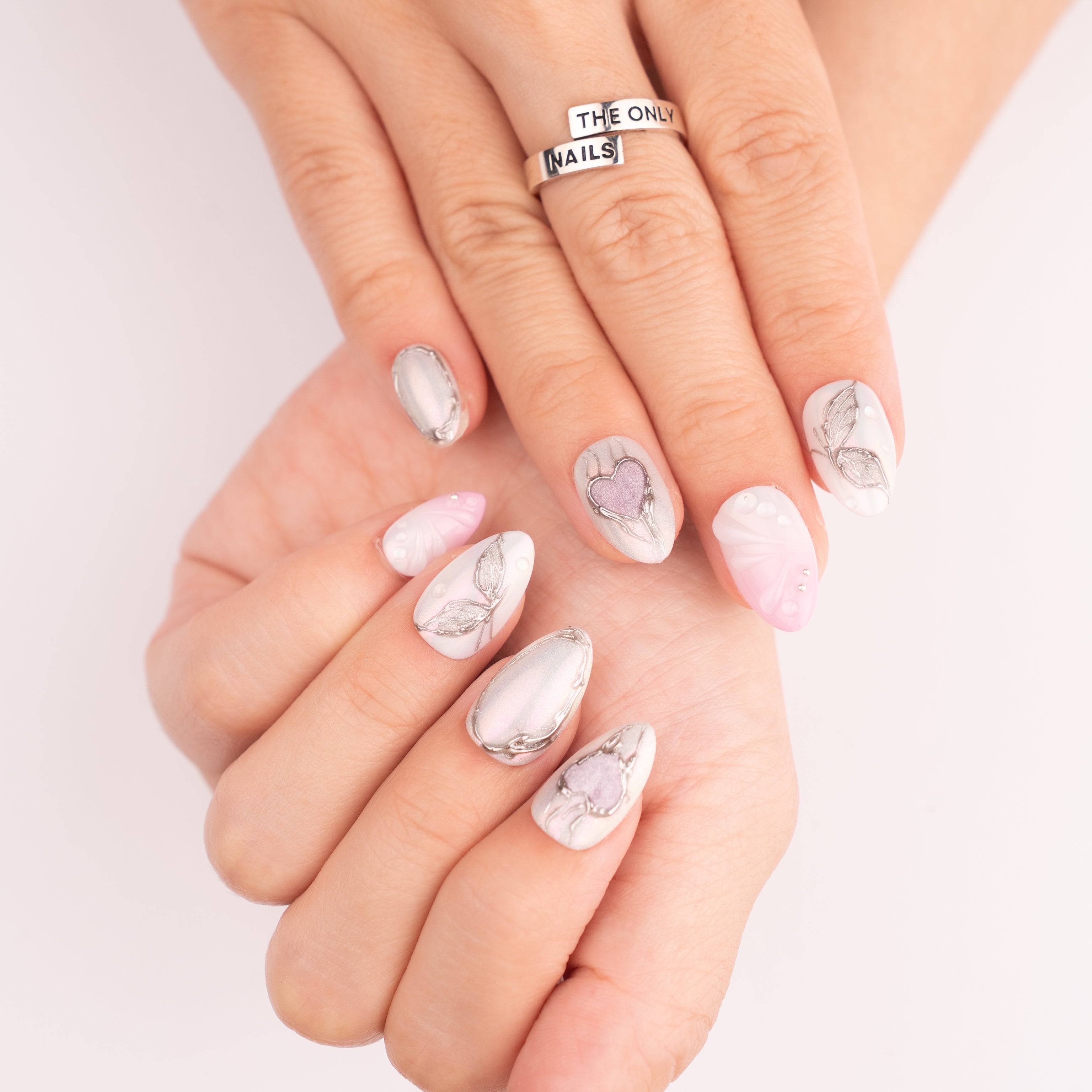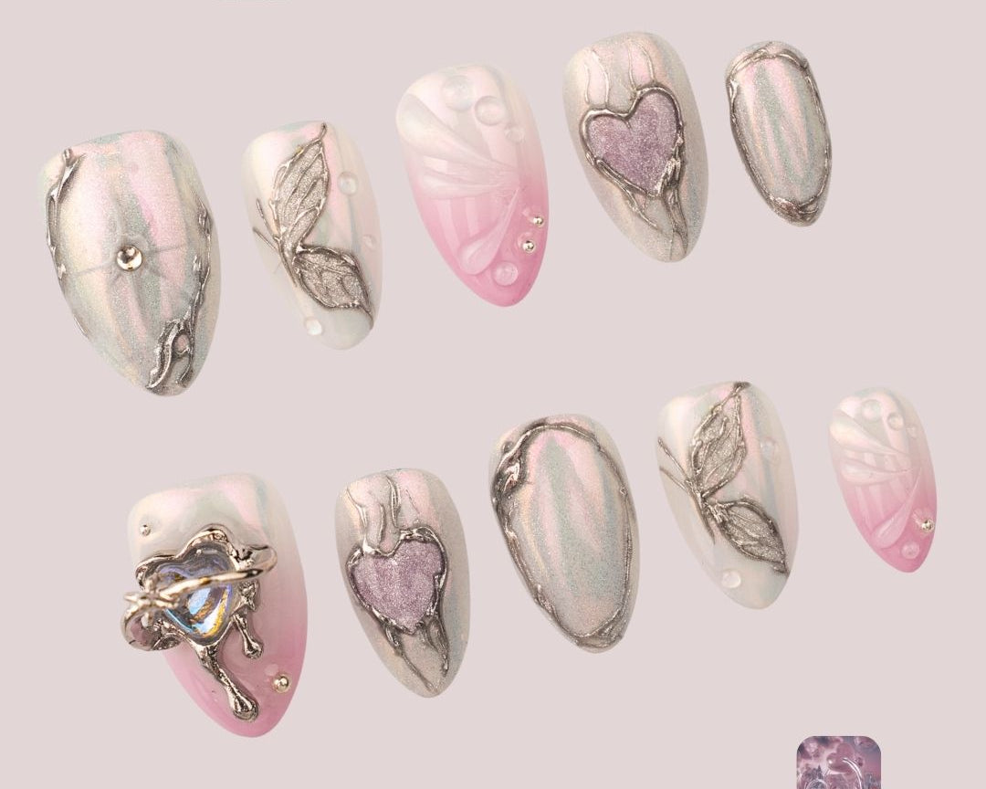 Ethereal and enchanting, Lunar Glow features soft iridescent hues with 3D heart motifs, delicate chrome butterflies, and sparkling highlights. Perfect for anyone drawn to dreamy, magical designs that look straight out of a fantasy.