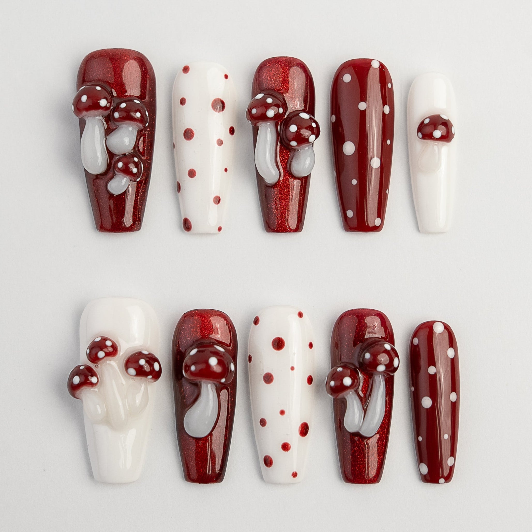 "Mushroom" – A whimsical design inspired by vibrant red mushrooms, handcrafted with premium gel for a bold yet playful look. Durable, reusable, and perfect for a touch of fairy-tale charm!