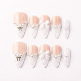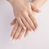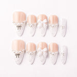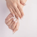 "Lace & Grace" is the epitome of timeless elegance, featuring delicate white lace patterns, soft nude tones, and luxurious pearl embellishments. Accented with dainty bows and intricate details, this set is perfect for bridal moments or anyone who loves a classic, sophisticated look. Let your nails exude romance and grace with this effortlessly chic design.
