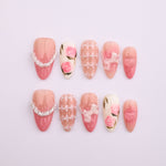Creamy rose tones combined with delicate floral patterns for a romantic finish. Soft pearls and lace-inspired textures add vintage charm. A graceful design that captures the sweetness of spring.