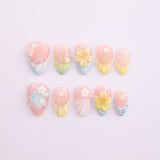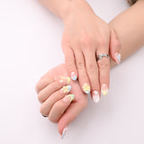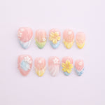 A joyful mix of coral, mango yellow, and soft pink inspired by sunny seaside mornings. Floral accents and gradient shades create a warm, tropical spring feeling. This design adds a bright and cheerful pop to any look.